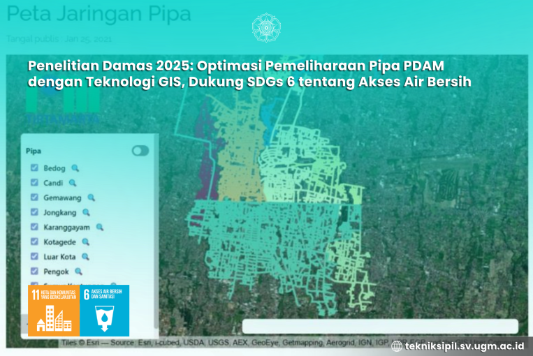 Melalui penelitian terbarunya, Dr. Ir. Sindu Nuranto, MS. melalui Penelitian Dana Masyarakat 2025 melakukan penelitian dengan judul “Analisis Tingkat Kebocoran Pipa Distribusi Air Minum untuk Optimalisasi Pemeliharaan.” Penelitian ini sejalan dengan SDGs ke-6: Clean Water and Sanitation, khususnya bertarget tentang peningkatan efisiensi penggunaan air dan pengurangan kehilangan.