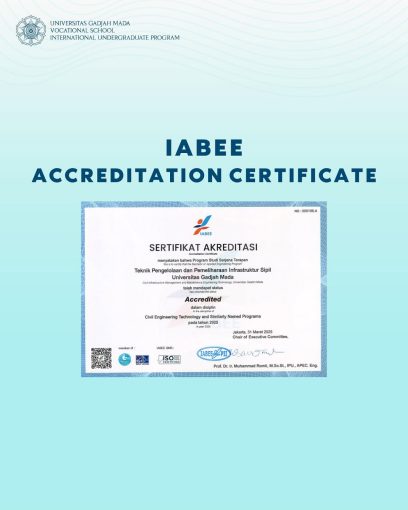 Yogyakarta, April 2025 — Departemen Teknik Sipil Sekolah Vokasi Universitas Gadjah Mada (DTS SV UGM) dengan bangga mengumumkan bahwa Program Studi Teknik Pengelolaan dan Pemeliharaan Infrastruktur Sipil (TPPIS) secara resmi telah meraih akreditasi internasional dari Indonesian Accreditation Board for Engineering Education (IABEE).